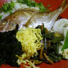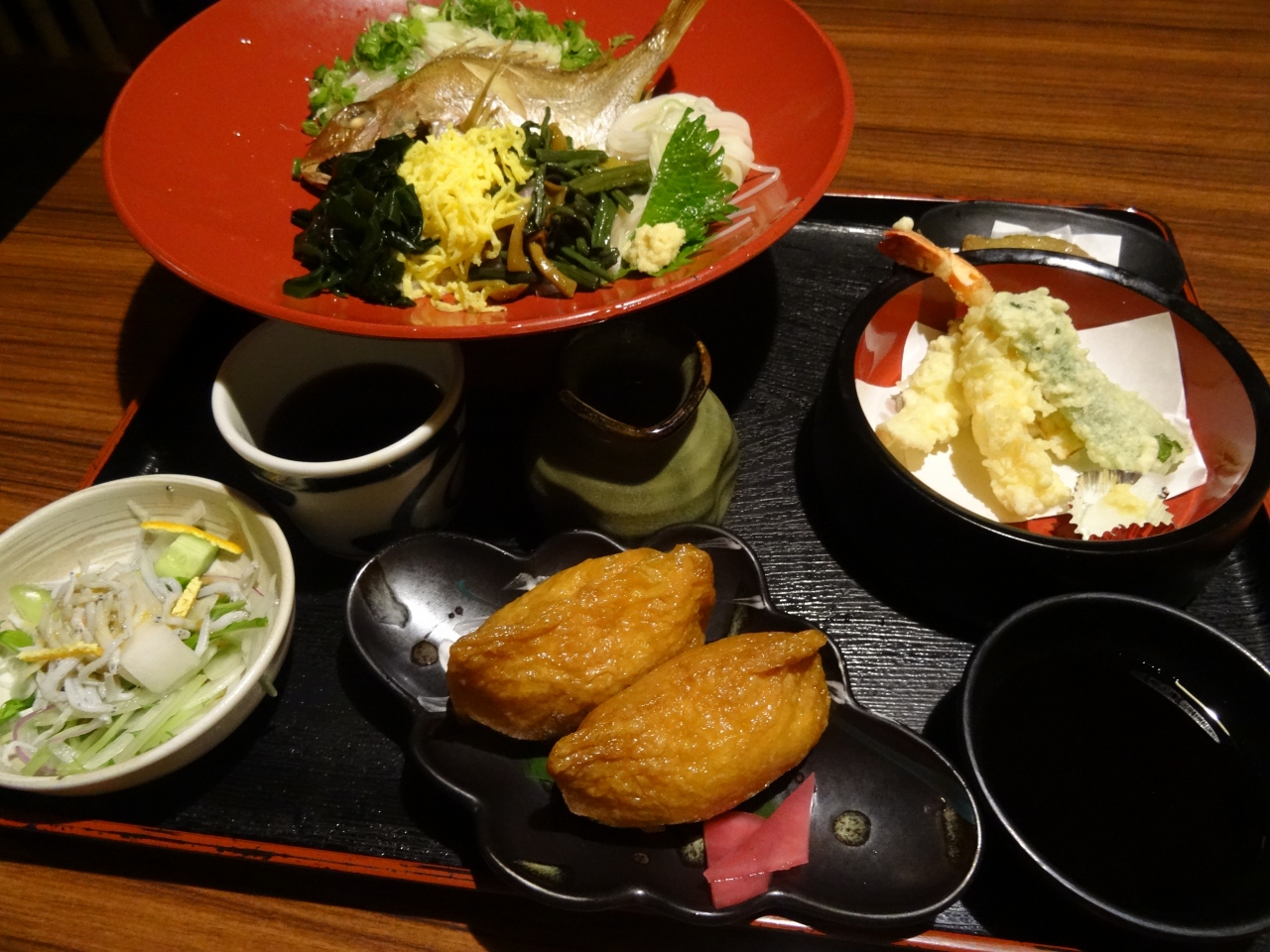 鯛そうめんセット2280円を注文する。姿見と切身があったが、姿見の方が少し高い。内容は鯛そうめん、みかんいなり、ジャコカツ、ちりめんサラダ、天婦羅。観光客にはうれしい良いとこどりのコンパクトなセットだ。