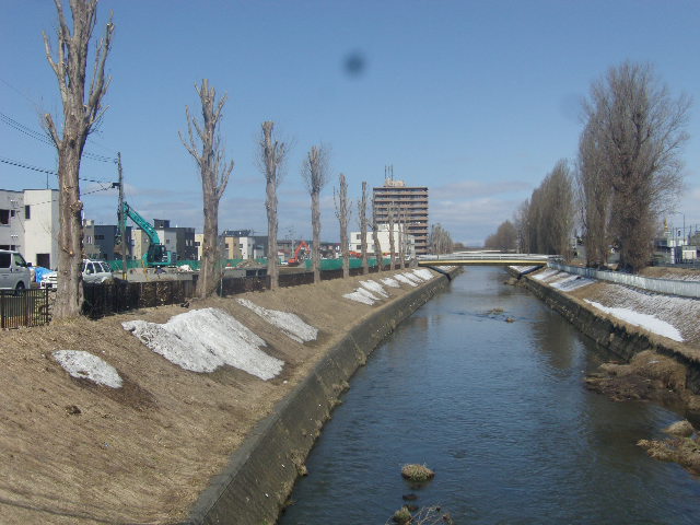 心地良い春の陽気に誘われて、久し振りにこちらのポプラ並木を観に行きました。すると驚いたことに、川の片側沿いのポプラが大胆に選定されていて、非剪定の反対側のポプラとの対照的な風情を味わうことが出来ました。勿論、また成長して箒のような姿になるのですが、角を落とした動物を眺めるような、何となく寂しげに見える光景も良いものだなと思いました。私は今回は真昼間に眺めましたが、人生の斜陽などを照らし合わせながら、西陽に照らされる夕方に眺めるのが良いかもしれないですね。