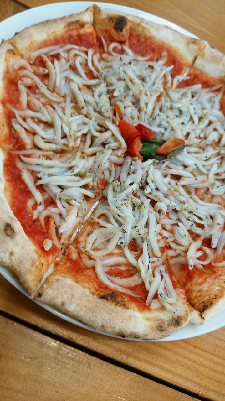 廃校を利用した道の駅にあるので、店内に黒板が設置されています。おしゃべりしながらクラスメートとランチ気分。私のおすすめは、ゴルゴンゾーラのピザ。ハチミツをたっぷりかけてどうぞ🎵画像はシラスのピザです。シラスが大きすぎてびっくりしました。
