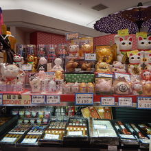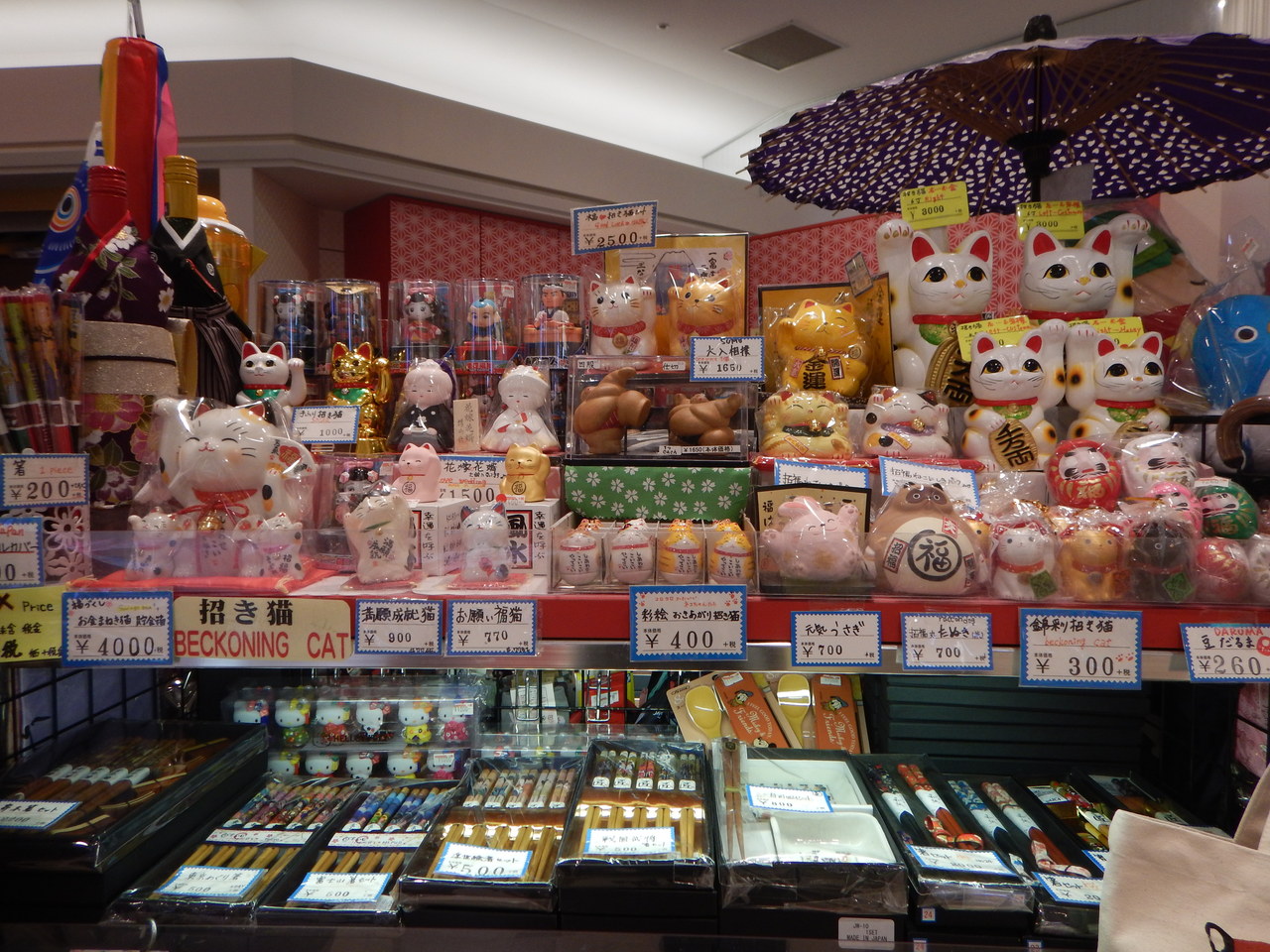 成田空港第2ターミナル4階のお土産屋さんです。「おみやげ京成」の周りのお店も同じような店が多くて、店と店の境目が分からないように思いました。こちらのお店の特徴と言えば、招き猫がやたらと目につきました。外国の方々をターゲットにしているのだと思いますが、漢字のTシャツとか、日本人からみたら変な形の着物のような物が売っていました。