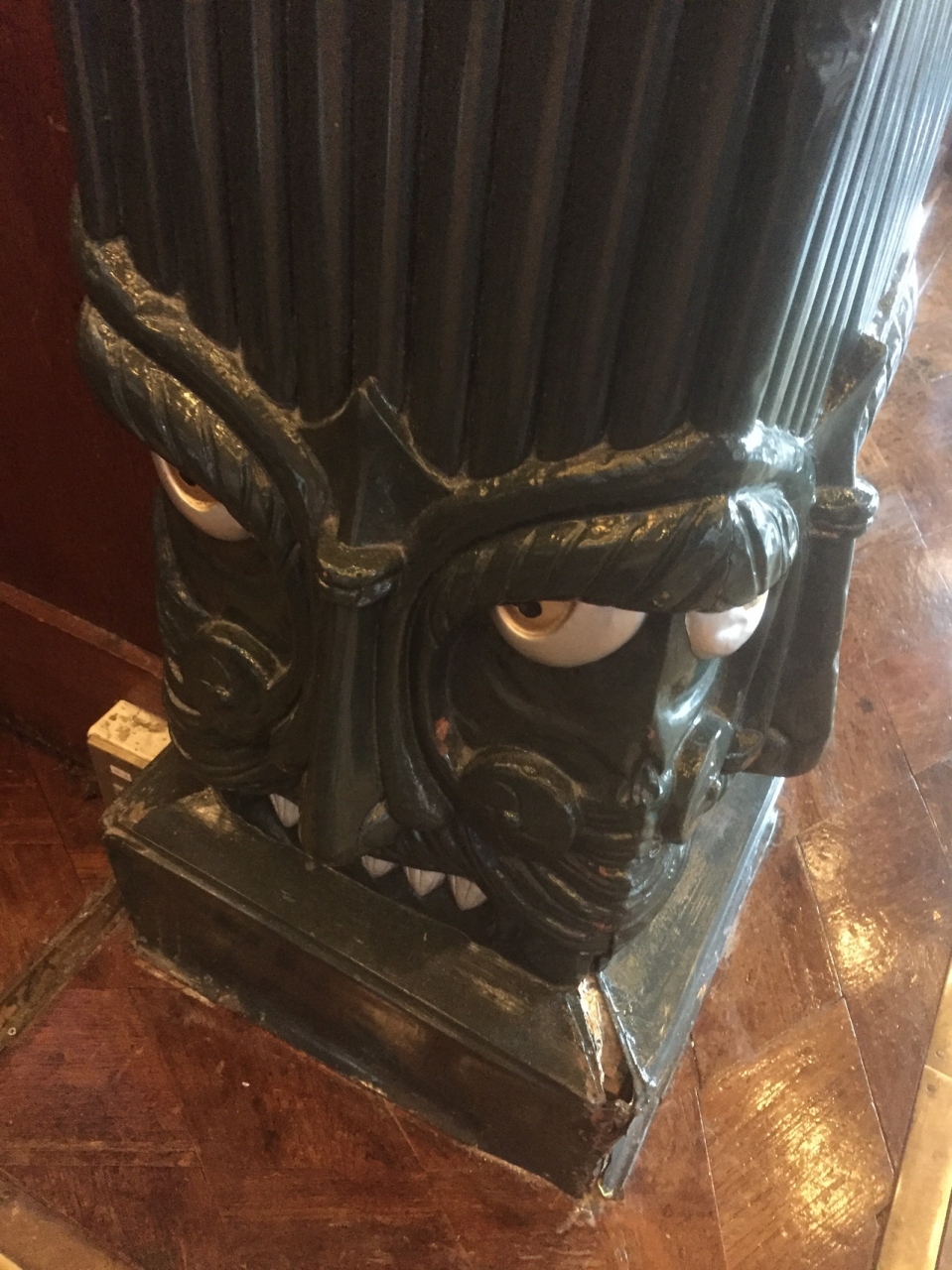 3代目がトーテムポールのようにスタッフを見守る彫刻、天井の高さなどいろいろ教えてくれます。