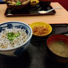 食券でアナゴ天丼と桜エビ丼を買いました。 メインに汁物それに一皿つく小鉢が選べました。 アナゴ天は大きかったです。