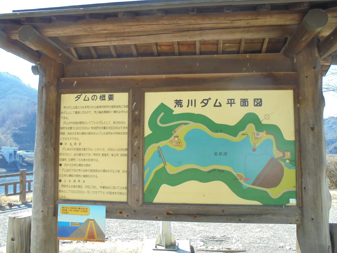 昇仙峡から車で少し奥へ進んでいくと荒川ダムの湖面が広がります。甲府市の上水道の供給と洪水調整のための多目的ダムとのこと。