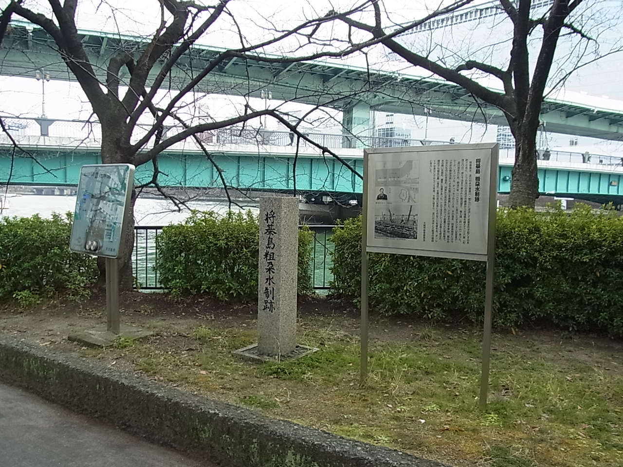 大阪天満宮駅から徒歩10分くらいにある南天満公園内の川沿い遊歩道(天満橋側)にあります。昔は淀川が逆流することで多々の水害が発生したそうですが、この治水のため明治6年に来日した3人のオランダ人によってこの将基島の粗朶水制が造られたそうです。今でも城北公園の北側にそのなごりが見れるそうです。興味のある方は是非。