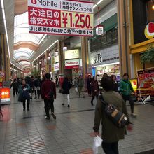 駅近くの大きなアーケード街です。人もたくさん、お店もたくさん、最近のシャッター街とは違ってにぎやかでした。少しぶらぶらしましたが、飲食店や薬局など日常生活に必要なものだけでなく、お菓子などのお土産になりそうなのもあり、観光客も楽しめます。