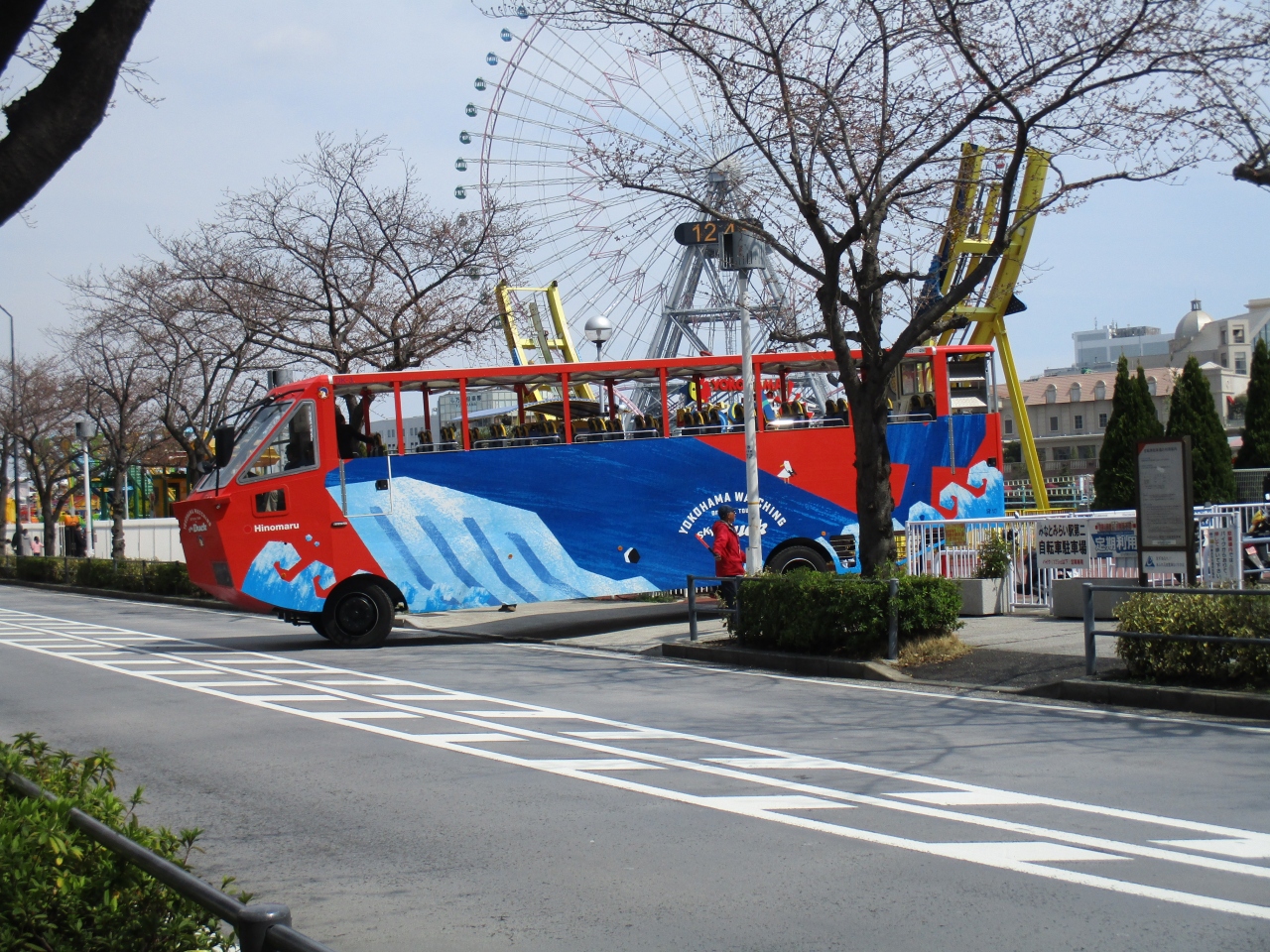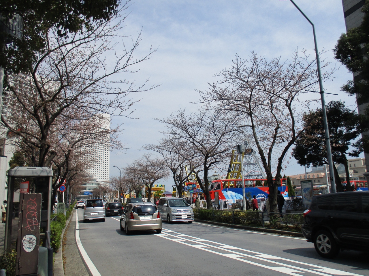 さくら通りは緩くカーブしていて、日本丸、コスモワールド、ランドマークタワー、クイーンズタワーがある通り。