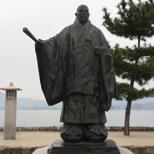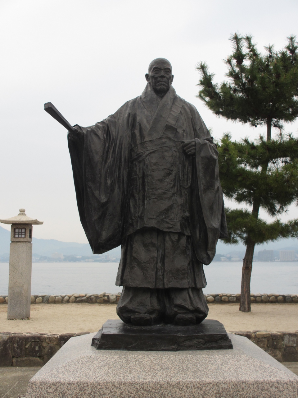 宮島桟橋前広場の海沿いに、京都の方向を向いて建っています。2mほどの青銅製で、当時の正装である袈裟を身に着け、観光客を出迎えています。建立されて3年程とまだ新しい像です。テレビドラマなどでは、源氏に敗れた平家の総帥という悪役のイメージがあります。しかしこの像は、海上に厳島神社の豪華な社殿を作り上げ、800年以上たった現在、世界遺産として登録される功績を成し遂げた清盛を象徴する、迫力ある像だと思います。
