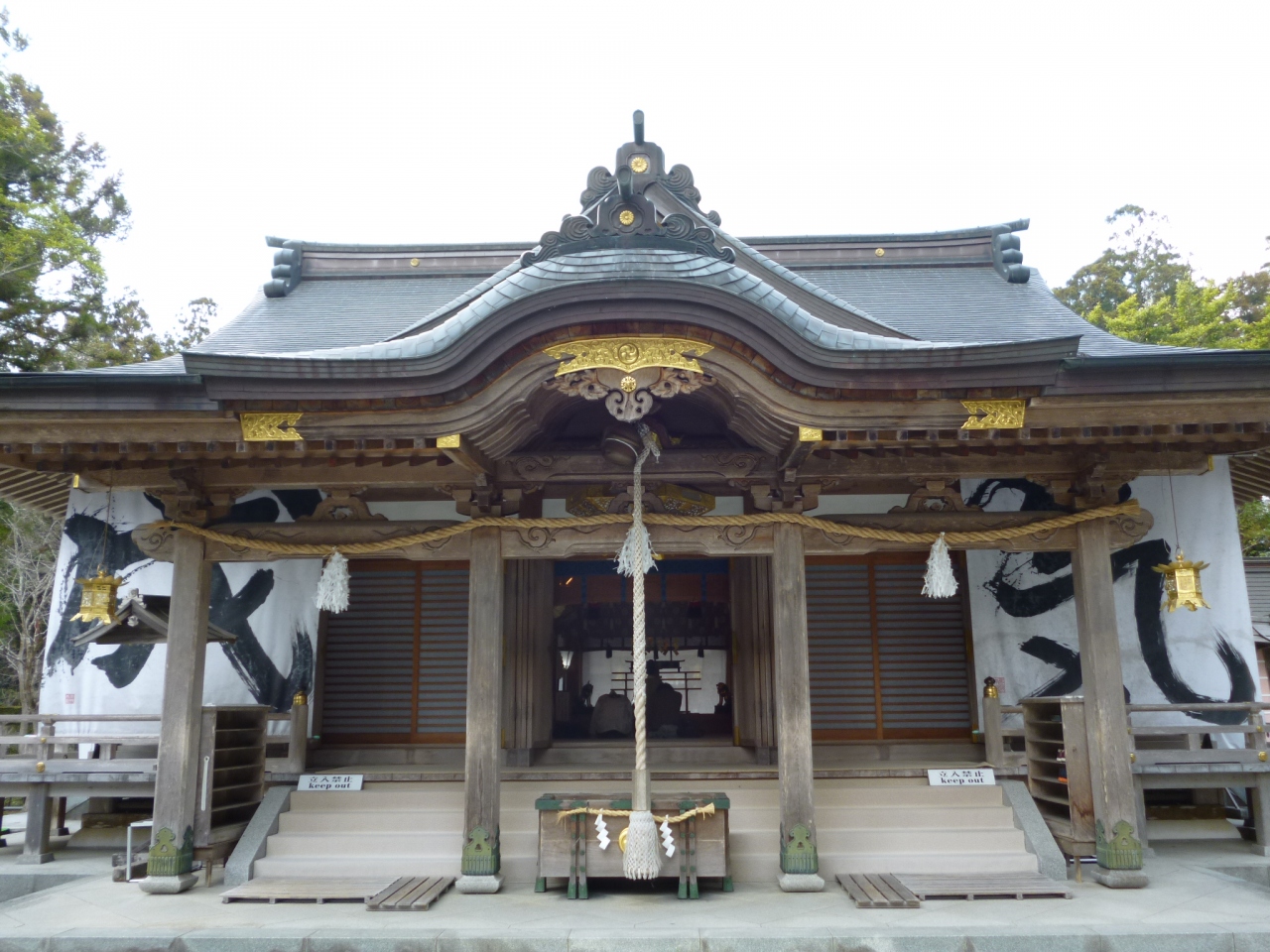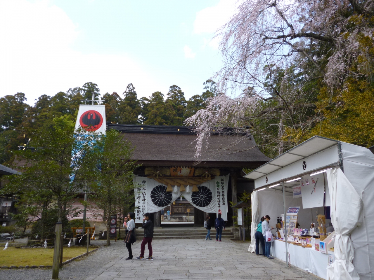 五條市から新宮方面に向かう国道168号線沿いにあります。大鳥居から158段の長い石段を上り詰めると神門が見えてきます。その先に本殿があります。石段の両側にはたくさんの幟が立っていました。神門入口の枝垂桜がちょうど見ごろでした。参拝には作法と順序があり、説明した看板がありますので、一読されてから参拝するのが良いと思います。サッカー好きな方は日本サッカー協会のシンボルとなった三本足の「八咫烏」のお守りを買われるのが良いと思います。