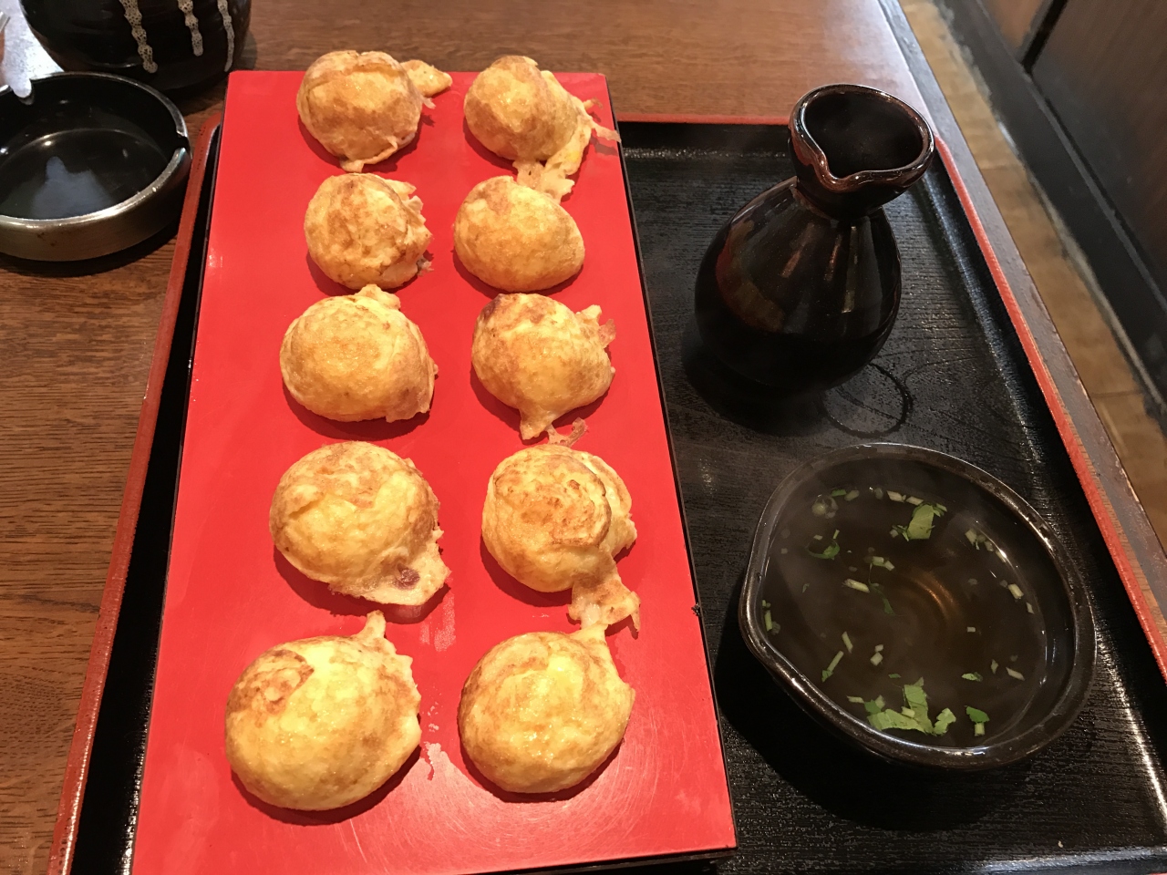 明石焼は卵が多め。ふわっとして、あっさり味のだし汁にうまく絡みます(だし汁は最後に飲み干してしまいます)