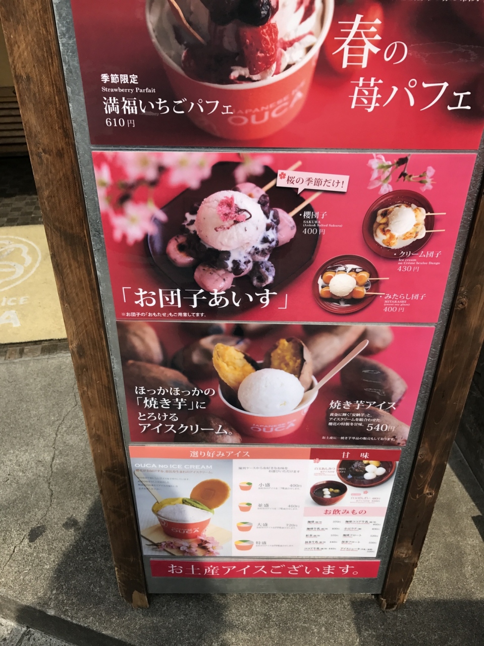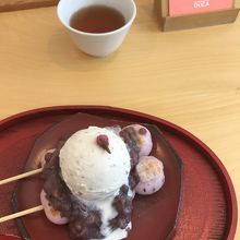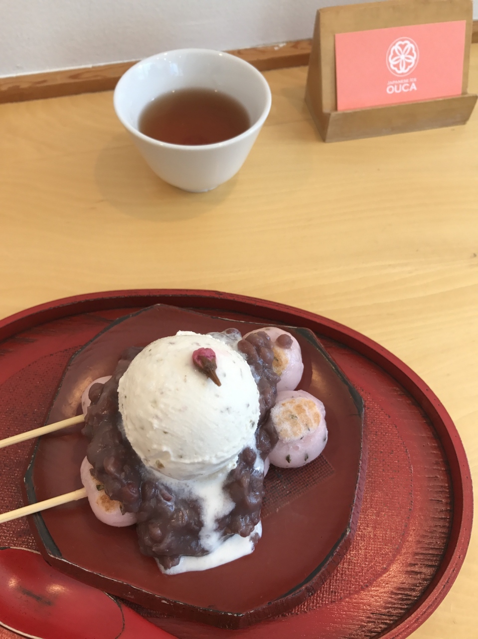 お団子にアイスを乗せた「お団子アイス」の春限定「桜団子」を食べました。温かい桜の葉入りの団子の上につぶあん、その上に好みのアイスを乗せて400円はお得だと思います。
