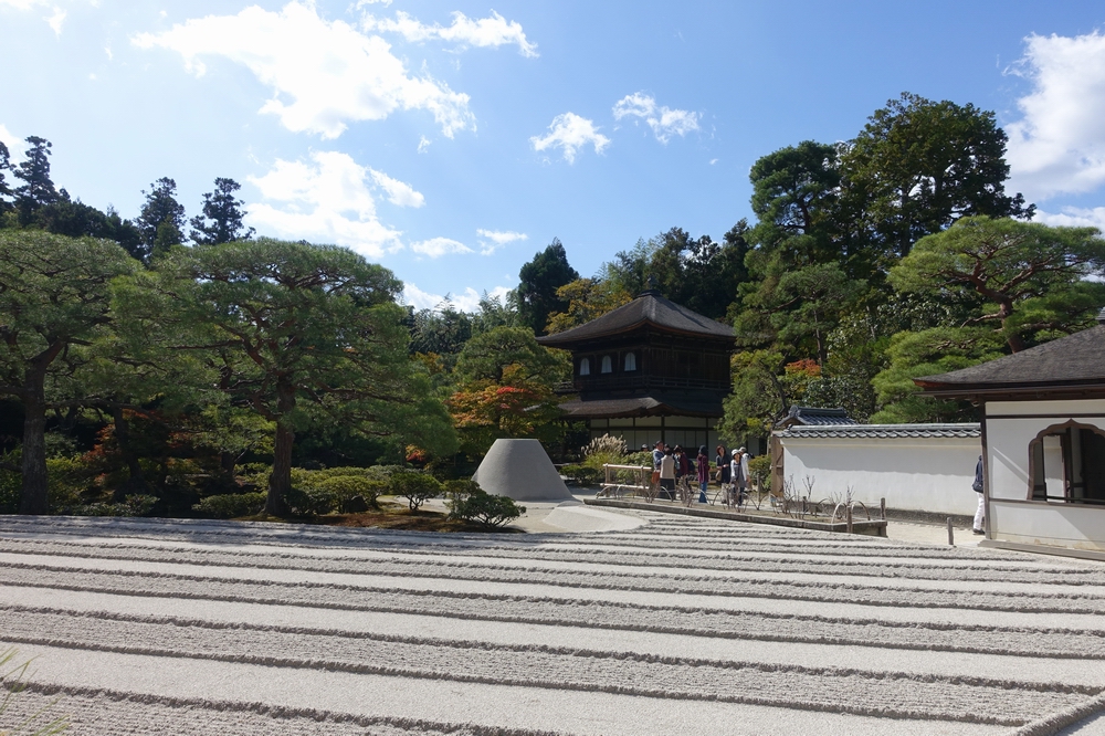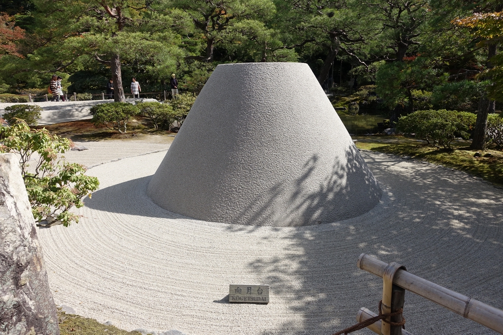 砂を円錐台形に盛った向月台と波のような銀沙灘は、銀閣寺の庭園の中でも特に印象に残る独特の風景です。何のために造られたのかは不明とのこと。向月台は台の上で月を観賞するためだとか、銀沙灘は月の光を反射させて本堂を照らすためだとか、諸説あるようですが、外観としては山と海を表しているのかなと思います。