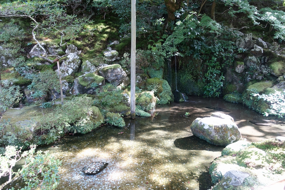 銀閣寺庭園の錦鏡池南東、拝観順路でいうと山へと登る手前にある滝です。滝が流れ落ちる泉に月が映り、泉のさざ波が月を洗っているように見えることが名前の由来だそうです。山からの湧き水で澄んでいて本当に月が映りそうだなと思いました。