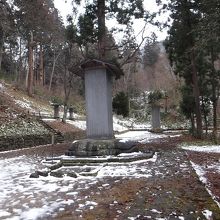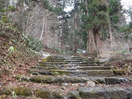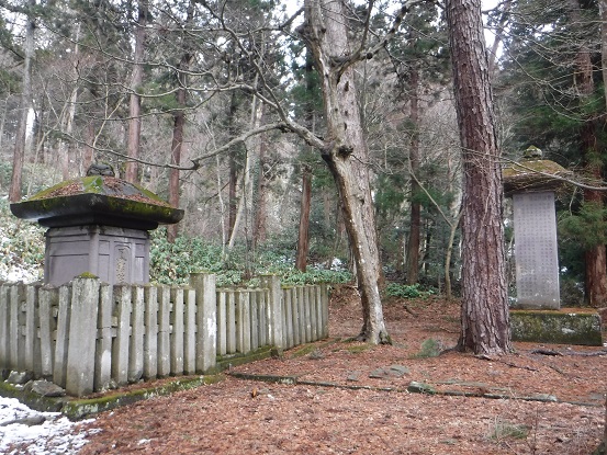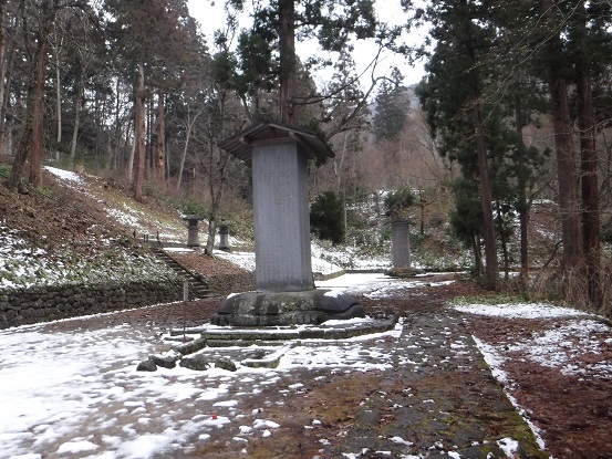案内板に「すぐ 松平家御廟」とありますが、入口を進むと目の前に石段が続き、ちょっとの距離では無さそうです。熊注意の看板もあったので、女一人みぞれが降る中行くのは、ちょっと抵抗はありましたが。行けども行けども中々着かず、やっと着いたと思ったら二代領主保科正経の墓所のみで三代以降の墓所はありません。更に奥に進まなければならないようで、せっかくここまで来たのだからと奥に進み、山道や石段を上がりました。