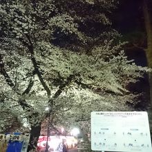 この日は18時頃にどしゃ降りの通り雨が降った後だったので、屋台も半分くらいのお店は閉まっていたし、シートを敷いて宴会してい人も少なめ。満開の夜桜を観賞しながら、園内を1周散策。