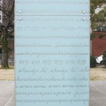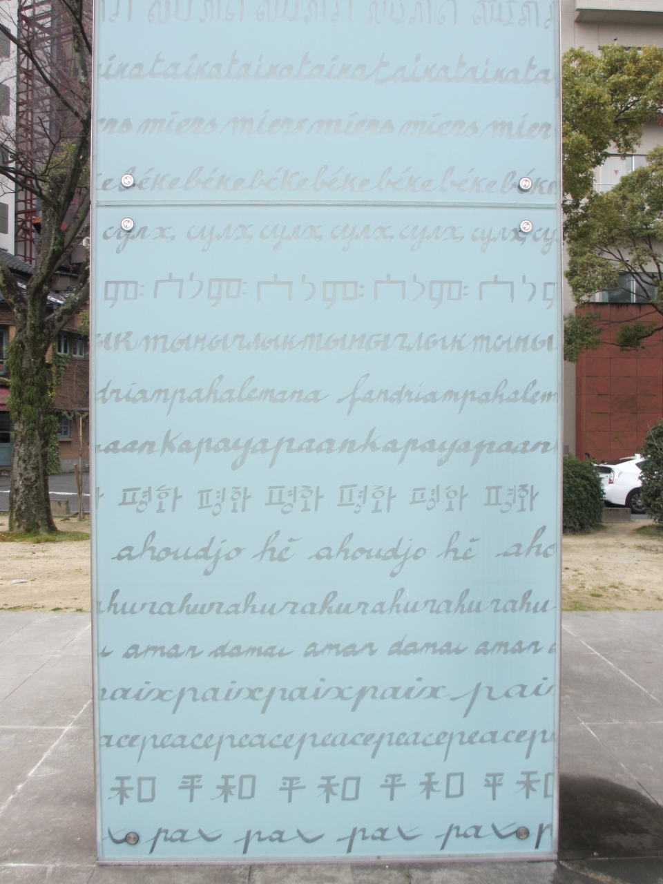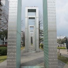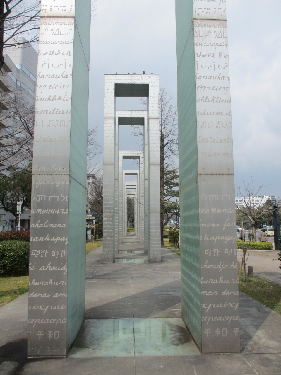 平和大通りを挟んで、平和記念資料館の向かいに立つ、連なった門のようなガラス作品です。作品には世界中の言葉で平和を意味する文字が書かれています。世界中の人々の叫びが文字となって表されている気がして、迫力ある作品だと感じました。資料館は多くの人が訪れますが、この作品を見るには道路を渡らなくてはならないため、あまり訪れる人がいないのが現状で残念に思います。