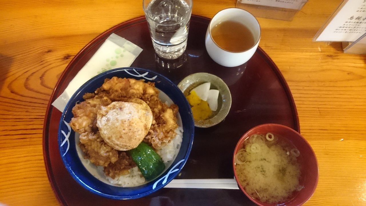 ここでしか食べられない半熟卵天と、とり天が乗った鳥親子天丼を注文。