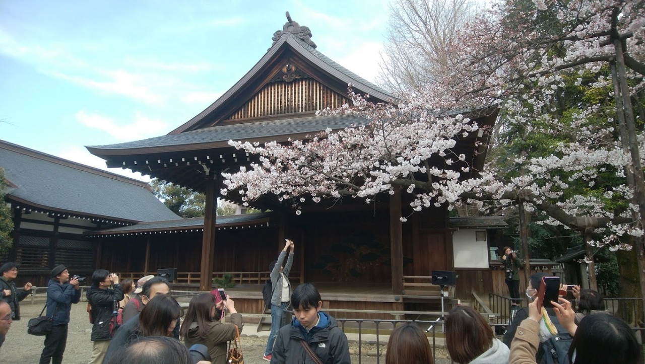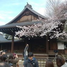 靖国神社の拝殿すぐ近くにある能楽堂ですが、東京の桜の開花判断する標準木の目の前にあります。明治14年に芝公園に建てられたもので東京最古の能楽堂です。明治36年に國神社の境内に移築されて以降この地にあります。120年ほどの歴史のある木造建築物の建物ですが、維持管理がかなりしっかりしているためか、古さは全く感じません。また、舞台の後ろの壁の松の絵がすごく趣を感じるものです。大きな能楽堂でさすが靖国の能楽堂という感じです。