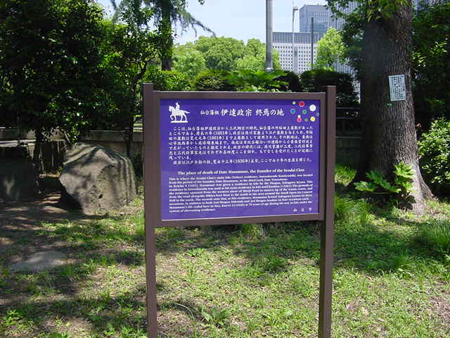 都心のオフィス街にありながら、緑豊かな静かな環境にある日比谷公園内にある標識。初代仙台藩主の伊達政宗が生涯を閉じた仙台藩上屋敷があったことが記されています。多くのファンを持つ歴史上の偉人なので、感慨深いものがありました。