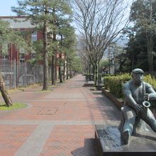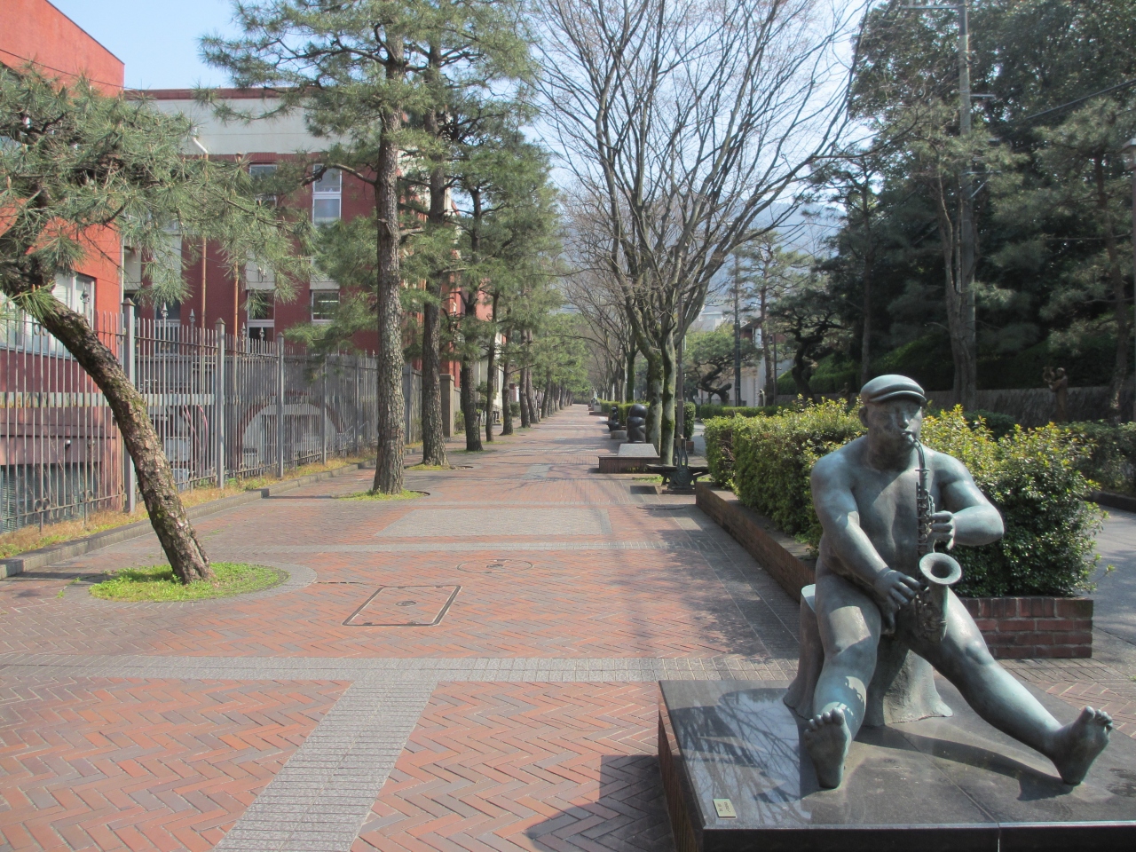 眼鏡橋バス停から入船山記念館へ向かう坂道です。車道の両側に幅の広い歩道があり松並木と彫刻が並んでいる静かな道です。平日午後、通る人は少なくオブジェを眺めながらゆっくりレンガの道を歩いて入船山記念館から眼鏡橋バス停に向かいました。旅の疲れをいやすのんびりした通りが気に入りました。入船山記念館を訪れる際に通ってみてはいかがでしょうか。