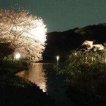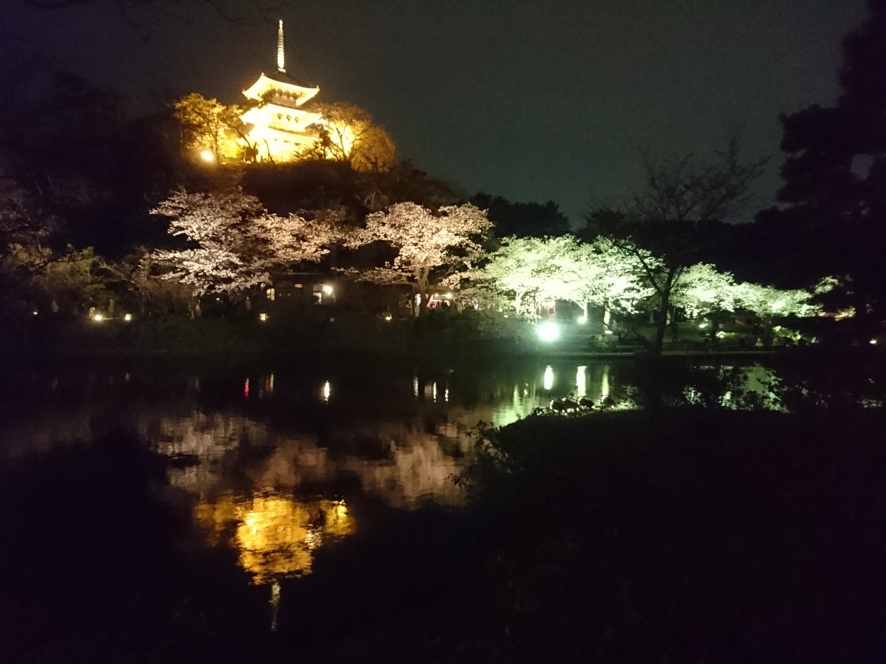 大池の周りのライトは明るすぎて眩しかった。写真を取るとライトがあたっている桜は白く写ってしまい残念。夜桜だけ為に500円は高く感じた。