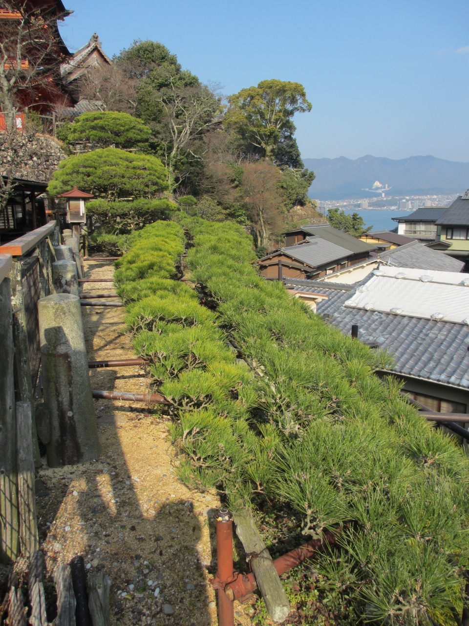 幸神社から豊国神社へ行く路地にあります。五重塔手前の塔之岡茶店の前に長く伸びる樹齢200年の立派な松です。手入れが行き届いていて見ごたえがあります。幸神社前の路地途中から見た五重塔、龍髯の松など見どころがあるので豊国神社へは龍髯の松前を通って行かれることをおすすめします。