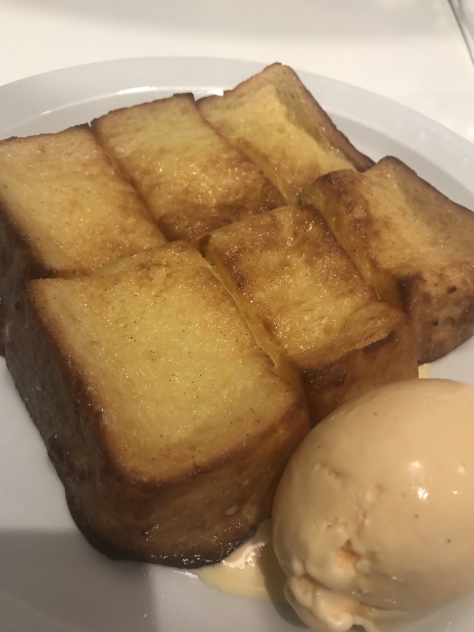 熱々にひんやり濃厚アイスのコンビネーションは最高ですが、濃厚なフレンチトーストなので甘党のわたしも胃もたれするかも~と思ったほどでした。