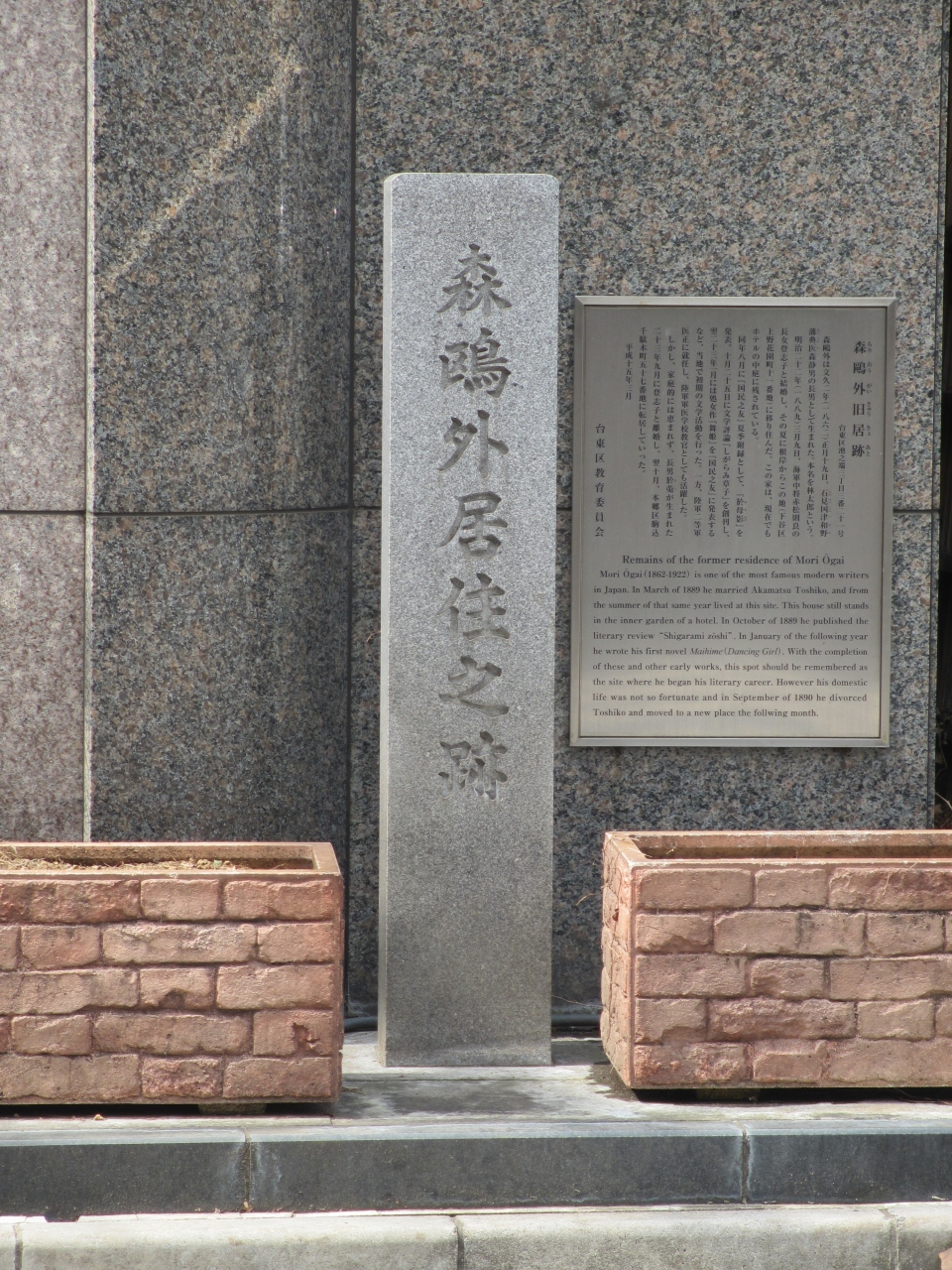 上野動物園内を走るモノレールの一駅・東園駅の向かいにある水月ホテル鴎外荘の角に石碑が立っています。鴎外の初期の作品が執筆された場所です。外からは見えませんが、ホテルの中庭には当時の家が残されていて、今でも食事や宴会にも利用されています。千駄木駅近くにある鴎外記念館と共に、鴎外ファンにとっては聖地と言える場所だと思います。