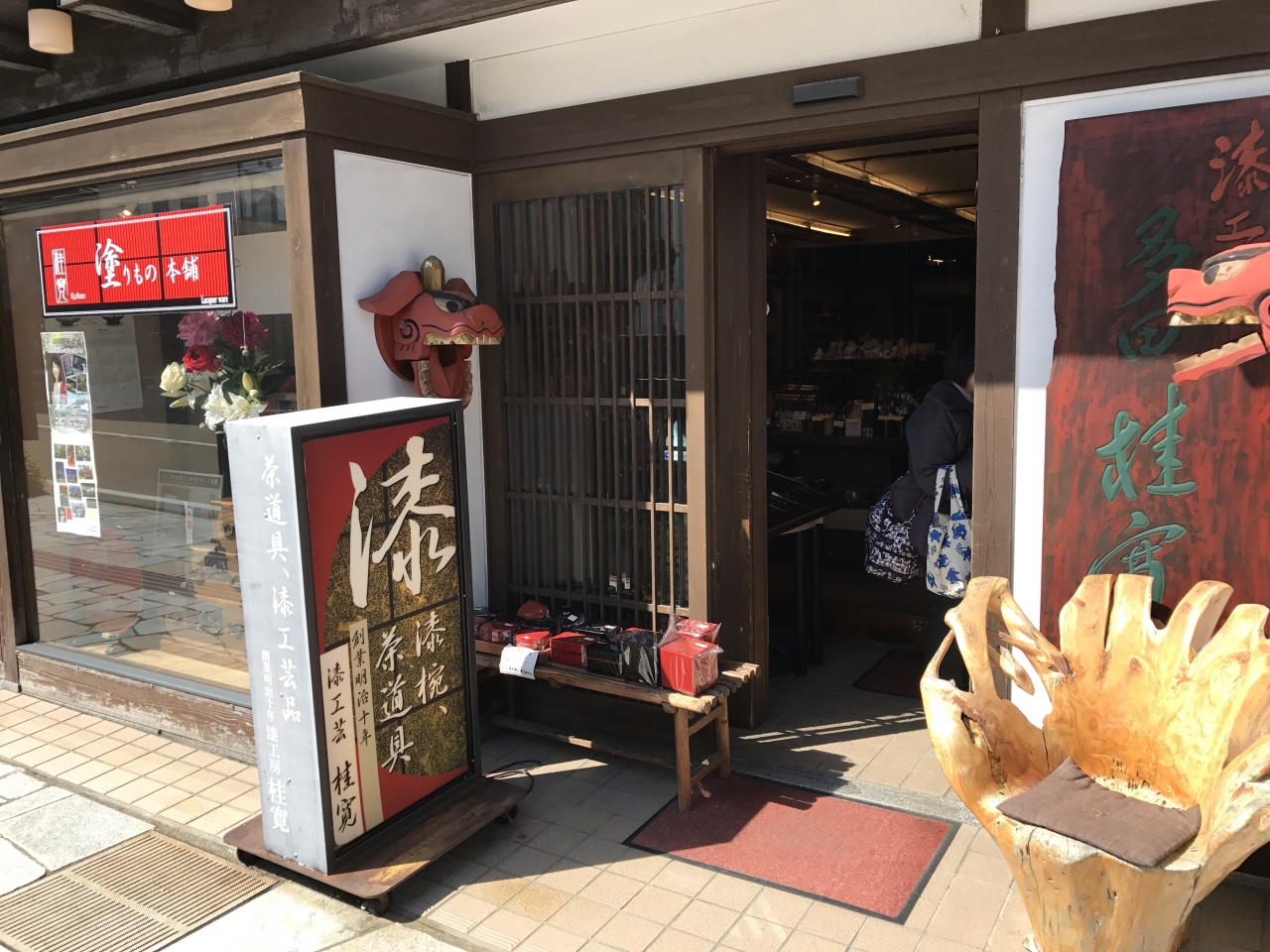 明治の創業以来、山中温泉で育んできた伝統の漆器・山中漆器がずらりと販売されています。器がメインですが、多田さんの丹精込めて造られた作品は、どれも光沢があり形が美しくほれぼれとしてしまいます。茶道具なんかは特に良さがわかりますね。