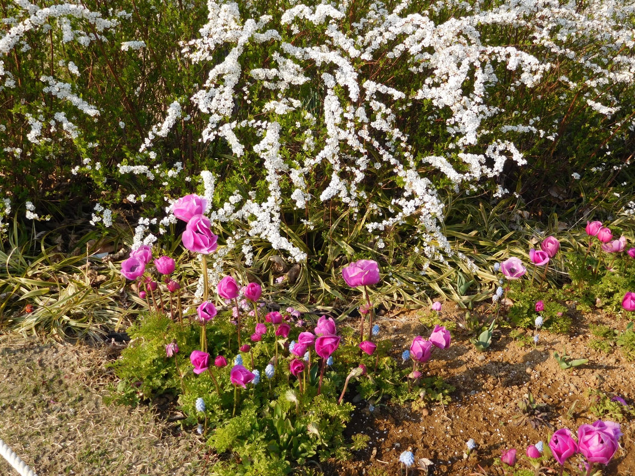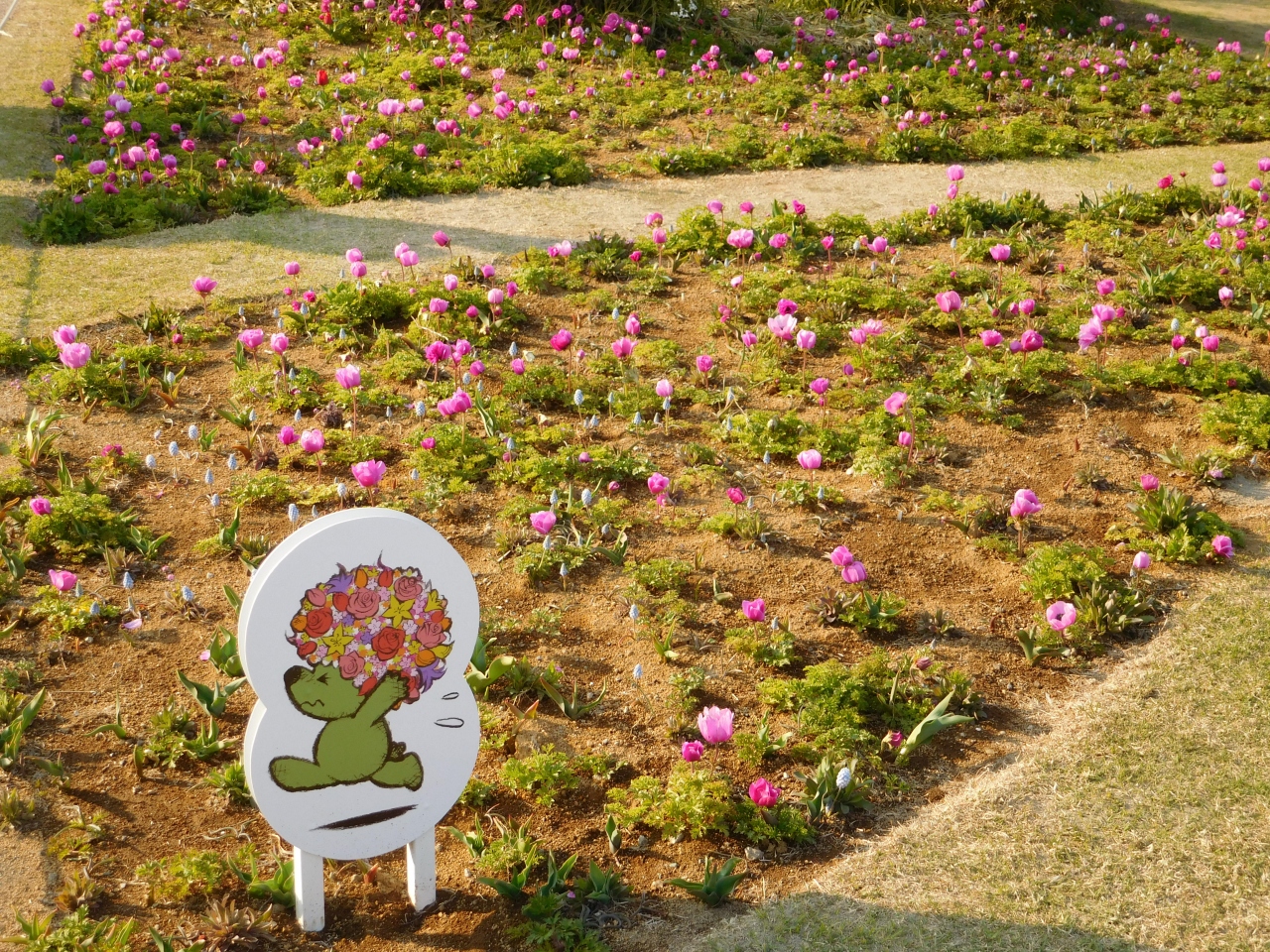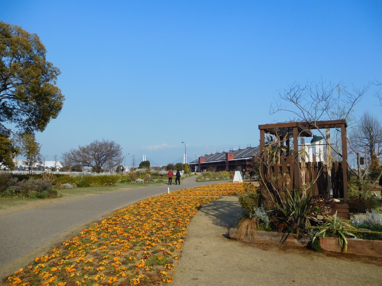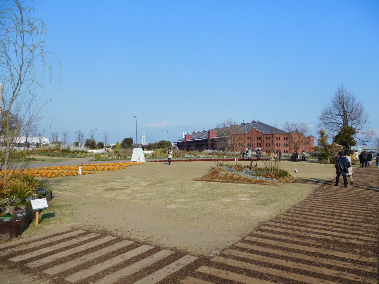 横浜ワールドポーターズから信号を渡って、横浜赤レンガ倉庫へと向かう途中にある、芝生の広がる広場で、「新港中央広場」と表示されていました。季節の花々などが植えられたり、綺麗に整備されているので、赤レンガ倉庫を入れて写真を撮ったりする事も出来ました。のんびりとしたお散歩コースの一つです。