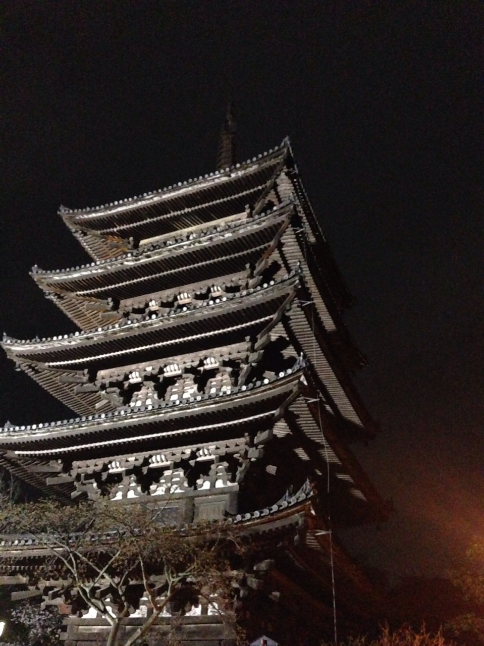 ライトアップが綺麗と聞き日が沈んでから訪れました。京都らしい細い路地を上がって行くと その先に浮かび上がるように塔が立って、確かに美しい。 木造で色がないものの 規則正しい細工が素晴らしかった。