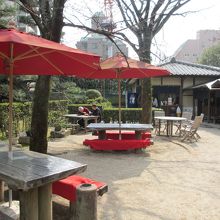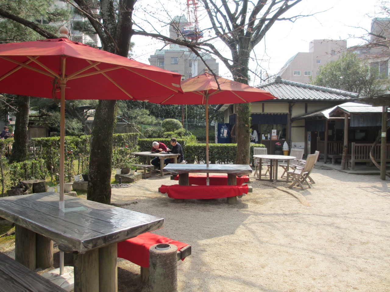 縮景園入口を入った左側にあるお休み処です。うどんセット、田舎むすびセット、ケーキセット、コーヒー、紅茶などがあります。コーヒーで一息入れました。赤いパラソルの下にテーブル席があり、藤棚の下にもテーブルがあります。桜の木があるので、桜の花や藤の花を眺めながら一休みするのにいいところです。入り口近くなのが難ですが、園内で食事が出来る場所がここだけなので利用している人がいました。花の時期に寄ることをおすすめします。