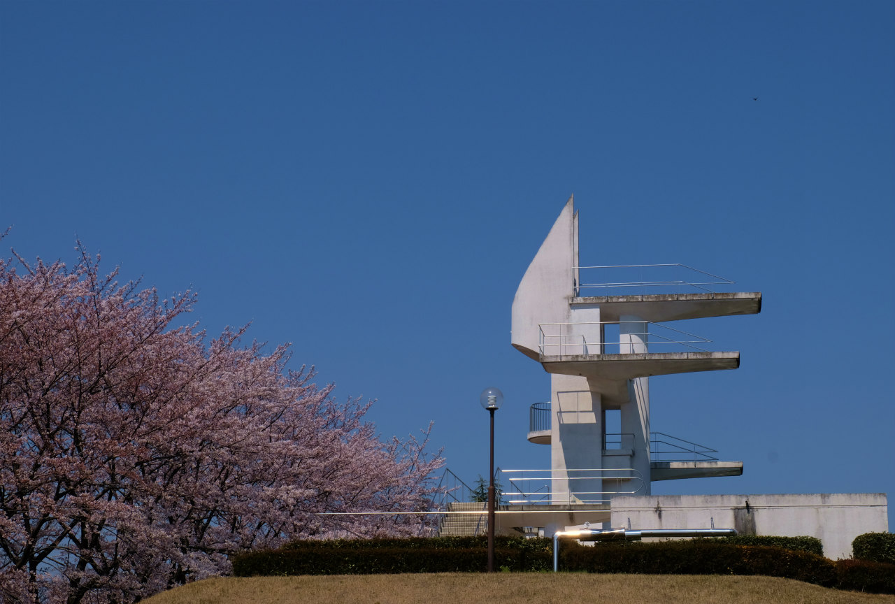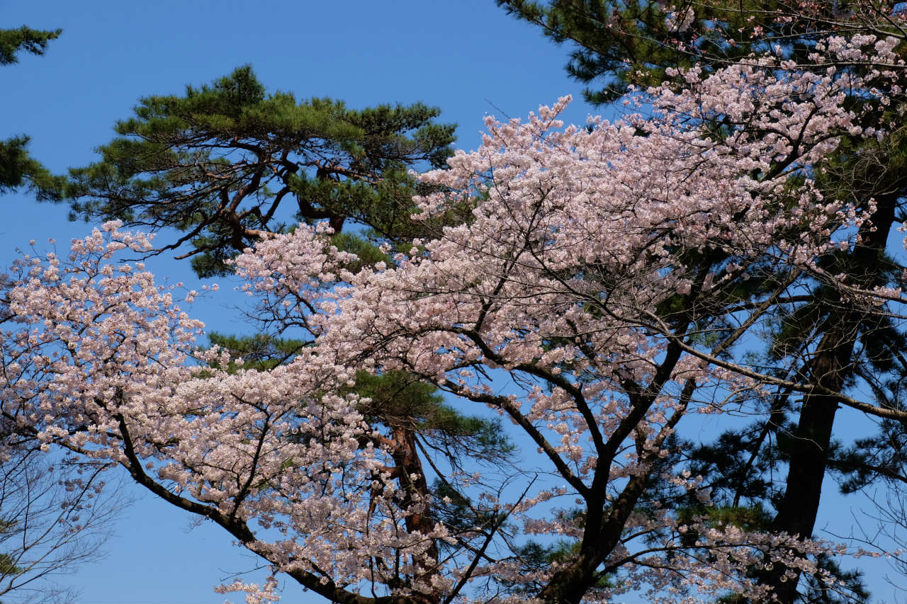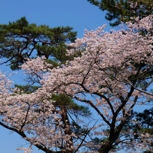 高台へと 広い。綺麗、100本の桜 樹齢100年を越す松林と