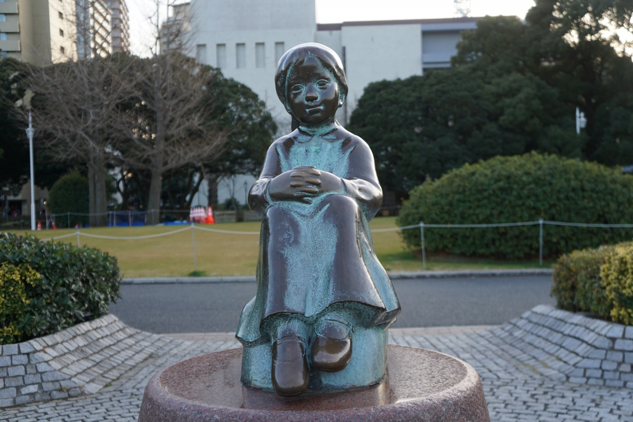 赤い靴はいてた女の子像は、山下公園では一番有名な像でしょう。意外に小さな像ですが、観光客が撫でていくので、体のあちこちがつるつるに光っています。