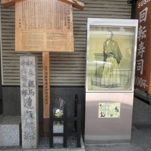 龍馬さんの写真と石碑、事件を書いた立て札