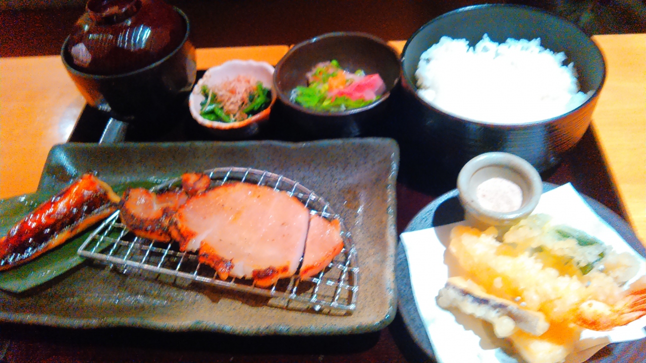 100円引きで、880円。中身はご飯、みそ汁、お浸し、刺身、天ぷら、豚焼き、サバ焼き。