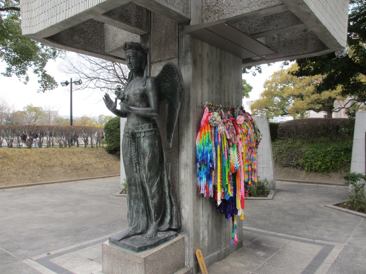 元安橋から原爆ドームへ行く途中にある1967年に建立された平和の女神像と塔です。塔は有田焼の陶板でできていて8羽の鳩がとまっています。日本語と英語の音声ガイドが聞けます。内容は4枚のレリーフが飾られている壁裏に記されています。壁裏に犠牲学生の学校名と氏名が記されています。全国各地の学校名が載っていて驚きましたが、県外学生名は慰霊塔建設に賛同し各地の空襲で亡くなった学生の名簿を送られた方を記したものだそうです。レリーフから動員された学生が行った仕事の様子がうかがえます。原爆ドームへ行かれる際に寄って音声ガイドを聞かれてはいかがでしょうか。