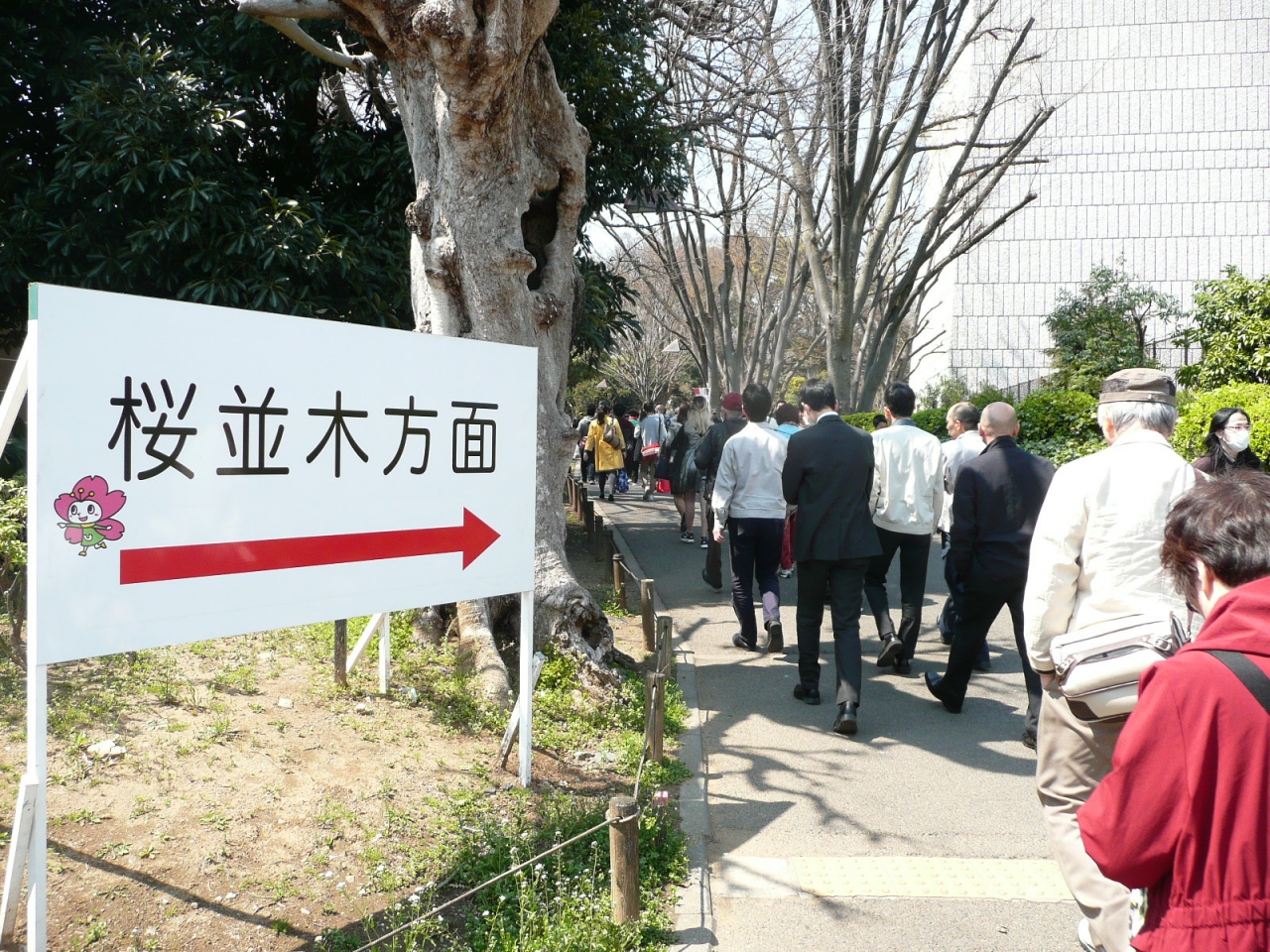 桜並木方面に向かうと、平日にも拘わらず、見物客が多数押しかけていました。桜並木の道は、満開の花が咲き乱れ、絢爛豪華な景観でした。