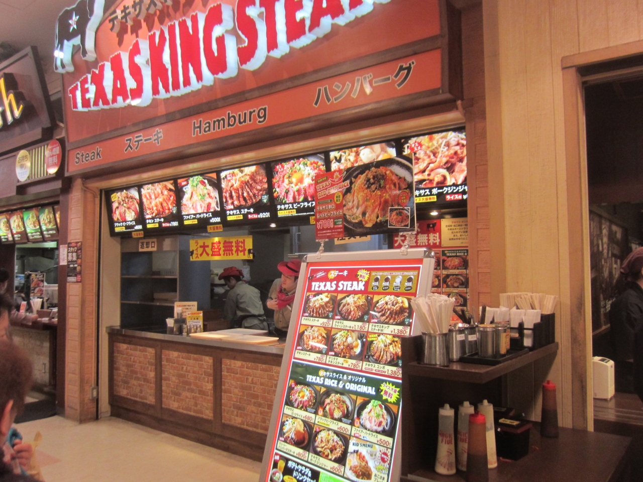 アリオ亀戸1階にあるフードコートにあるお店です。人気No.1と書いてあったのでテキサスステーキをいただきました。920円でご飯が大盛無料、ステーキソースは4種類から選べます。テキサスステーキはレアの状態で熱々の鉄板の上に載せられて出てくるので、ちょうど食べるころには程よい焼き加減になっていました。お肉をひっくり返すためのトングがつけられているので、席を探している間に鉄板が冷めないように頃合いを見てお肉をひっくり返すのを忘れないようにしましょう!メニューにはテキサスステーキの他、チキンステーキ・ポークジンジャー・ハンバーグ・ビーフライス・お子様プレートなどもありました。
