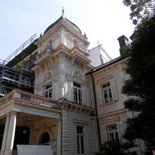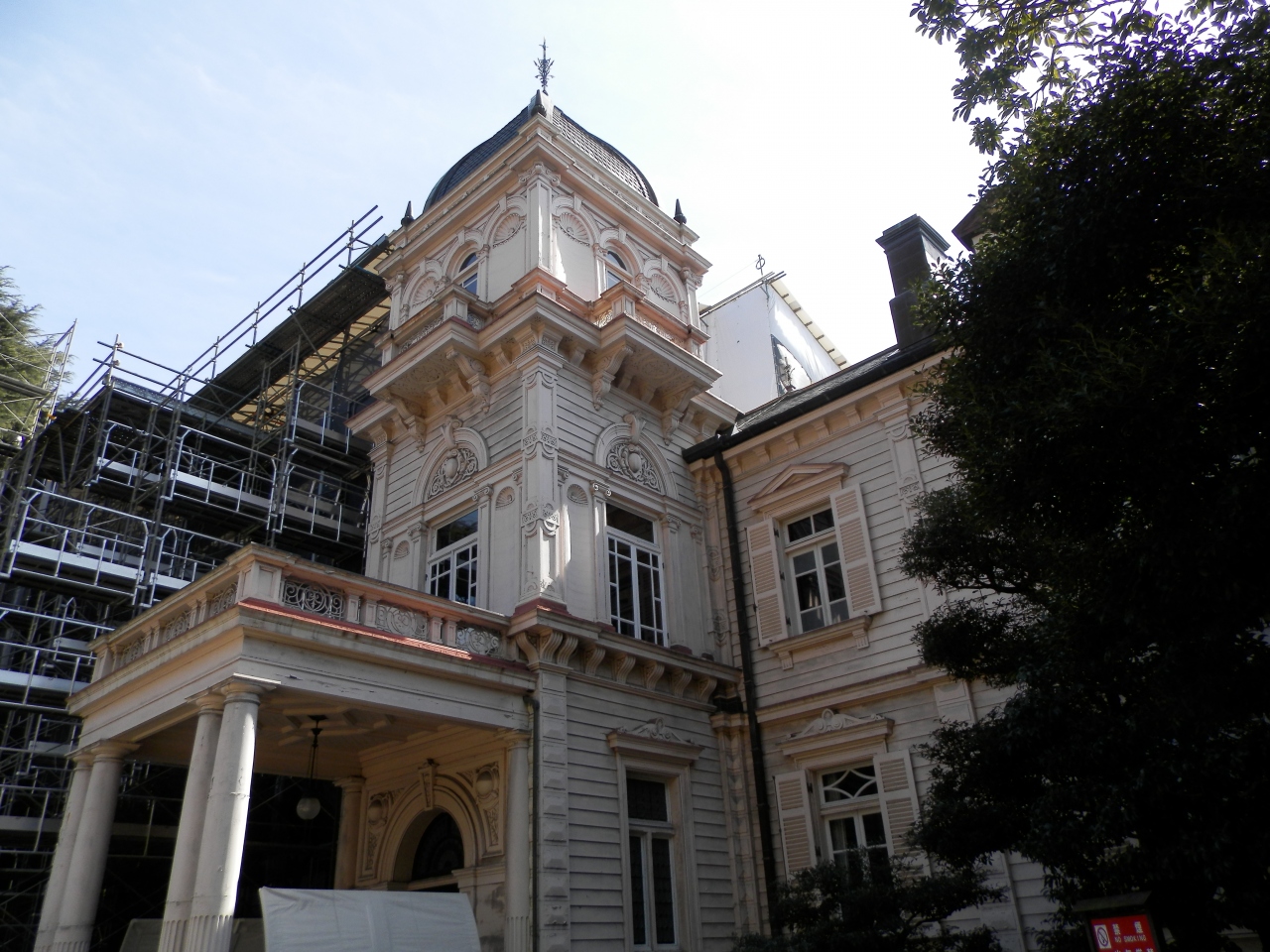 1896年建造、ジョサイア・コンドル設計で、現在は国の重要文化財に指定されています。庭園内に洋館とそこに併設された和館、別棟の撞球室があり、撞球室と洋館は地下道でつながっているそうです。17世紀ジャコビアン様式の装飾が施された洋館は美しいです。内部撮影不可です。