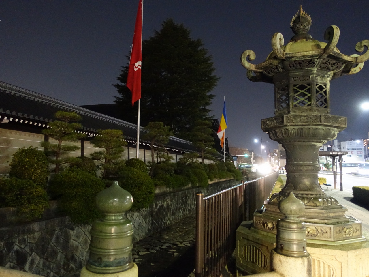 京都駅近くのレストランで夕食をとったあと、腹ごなしを兼ねて西本願寺の周りを一周してみました。見栄えのある壁が続き、その外側には濠があり、見ごたえのある立派な門がいくつもありました。世界文化遺産にも登録されているだけあり、凄いお寺だと思いました。