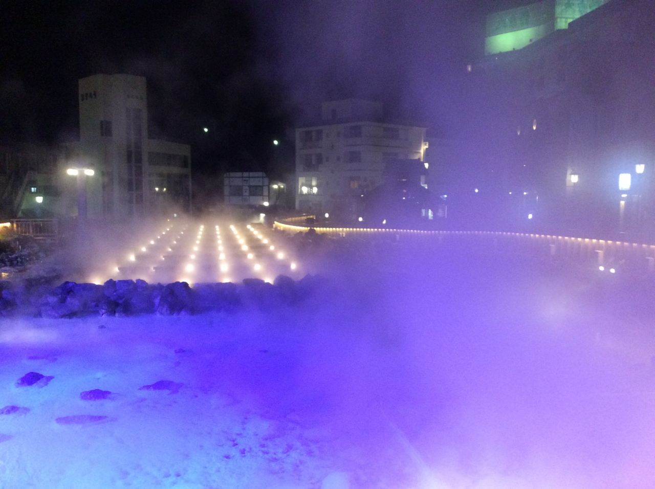 草津の湯畑前では夜間は モクモクと蒸気が湧き上がり、