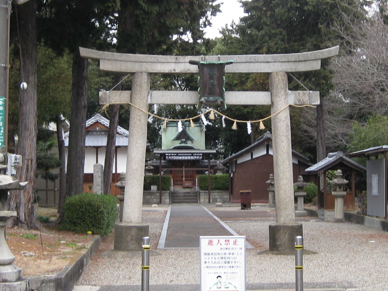 国道171号線と檜尾川の交差点から土手を南へ行った下にあります。住宅街にあり道が分かりにくいです。祭神は天野児屋根命で境内は静かで樹木に囲まれています、参道は住宅に囲まれていて残念ですが地元から親しまれている感じです。この周辺も寺院が多くありますのんびりと周ってみると良いと思います。