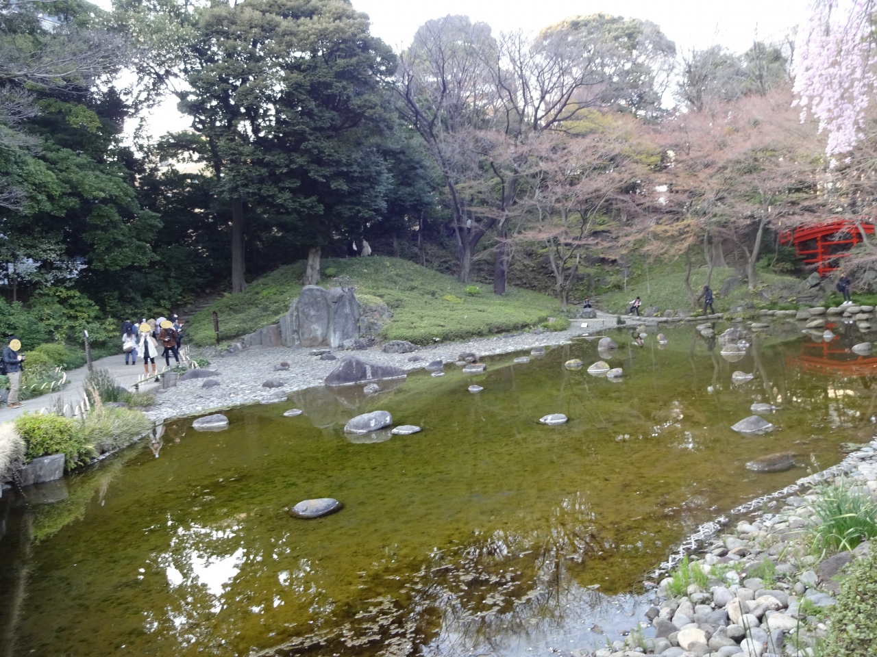 赤い橋が少し離れているところからも見えるし、この季節(4月です)は桜も咲いて散策には心弾みます。