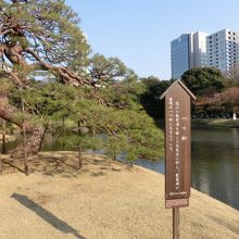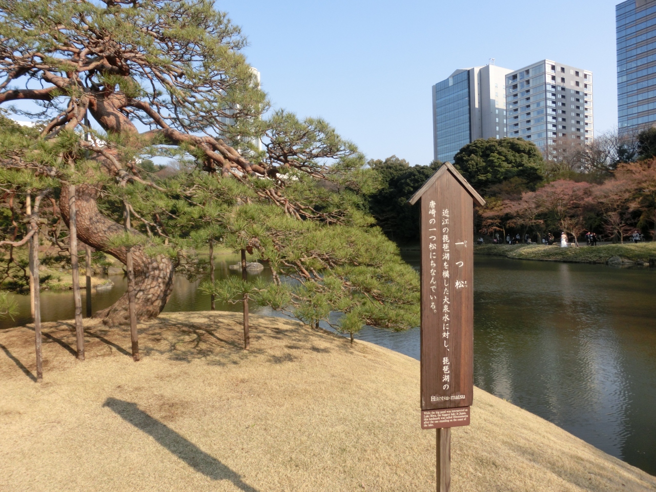 大泉水に向かってしだれ桜の左手に樹齢の古そうなひねこびた松の木が一本。