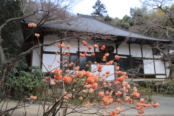 本堂は質素ですが色々な花が咲いていて楽しめました。オレンジ色のミツマタの花は初めて見ました。普通の黄色のミツマタの花もありました。