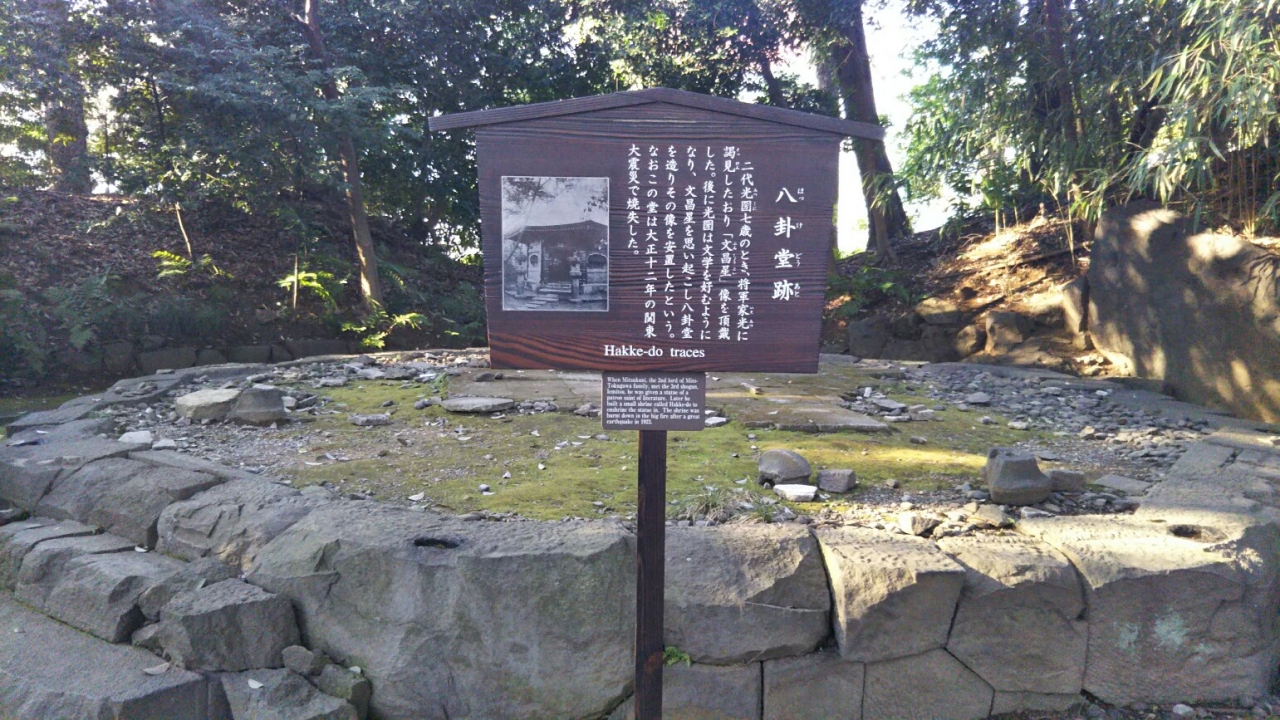 庭園の北のはじっこ、坂道を上がると、八角形の石組みとそれについての解説標柱がある。