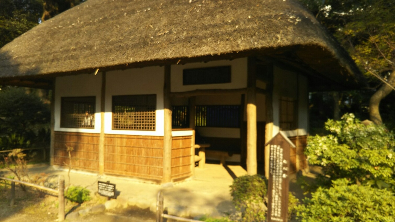 庭園の東側、赤門の手前、松原の中に建っている茅葺きの庵風の建物。
