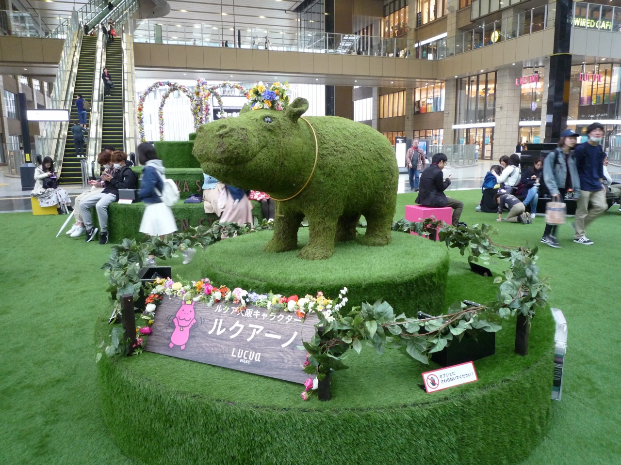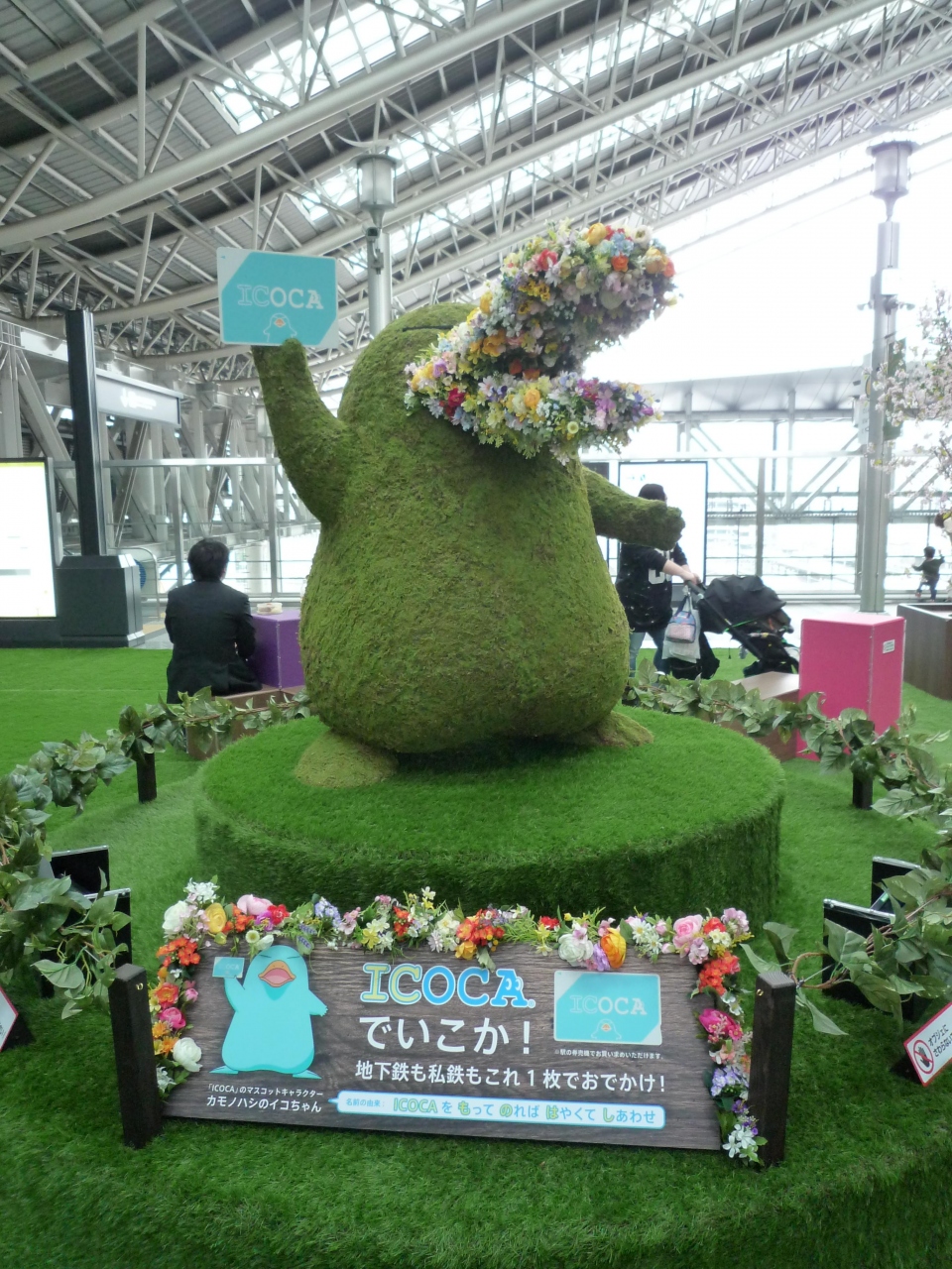 人口芝生が敷き詰められて、JR西日本のキャラクターのカモノハシのイコちゃんや、