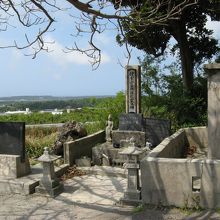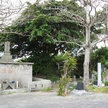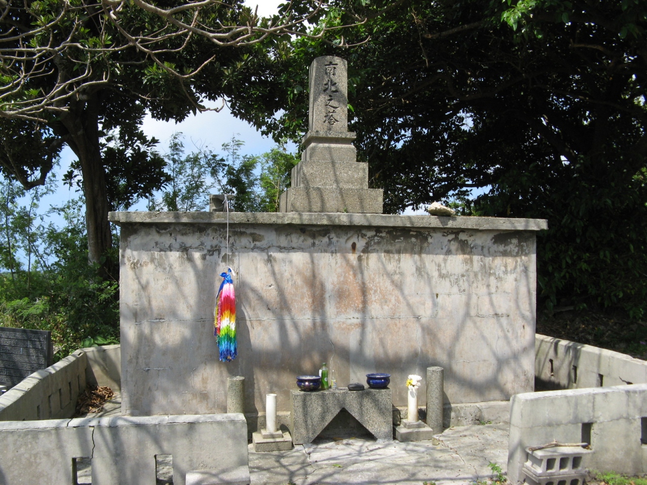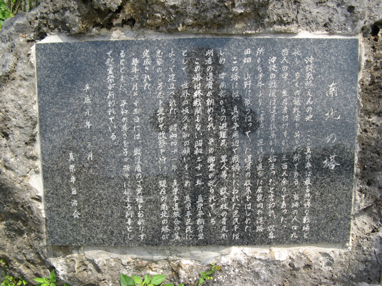 県道250号線の真栄平バス停の西側20mほどのところにある(バス停から最初の脇道)間道を北に向かって道なりに500mほど進むと、右手に“めへだいらむら御嶽(宮里嶽)”があります。その先すぐを右手に入り、200mあまり進むと左手に「南北之塔」が祀られています。