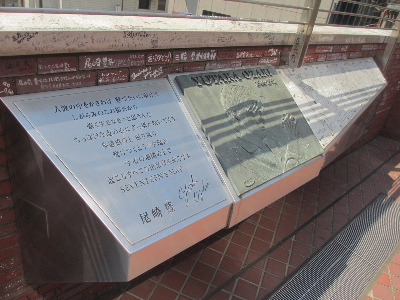 初めて見ました。渋谷駅の東側にあるクロスタワーという名前のビル(旧東邦生命ビル)の2階、ビルの外で道路よりの場所南西側にプレートがあります。「17歳の地図」の一節が書かれています。たくさんの書き込みがありファンの思いが伝わる場所でした。